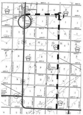 The detour selected is County Road L54. The blacktop from Highway 18 to Calumet is the north/south substitute road. The detour runs east on B40 from Highway 59 at Primghar to L54, a 3-mile jog. The route turns south 8 miles to Highway 59. The intersection is 5 miles west of Sutherland and just south of the intersection of Highways 59 and 10 West.