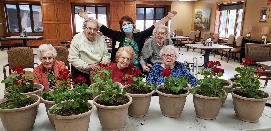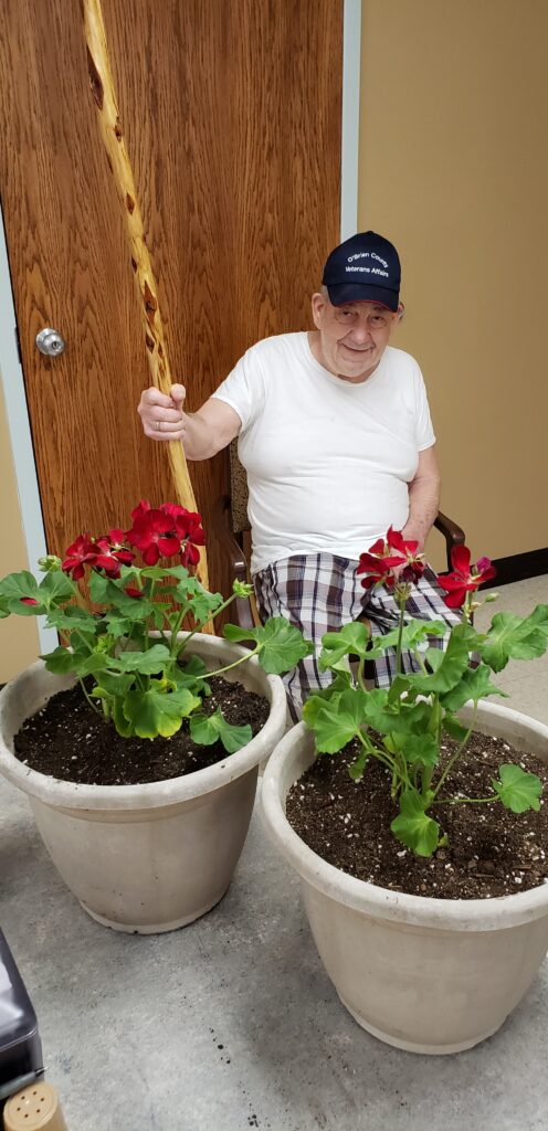 Ivan (Butch) Edwards, originally of Primghar, donated geraniums to Community Memorial Health Center to celebrate National Nursing Home Week, May 9 – 15, and the great care he receives there. This year’s theme – Through the Seasons – was marked with special activities highlighting each season throughout the week. Monday, Spring Fling; Tuesday, Summer Hawaiian Luau; Wednesday, Summer County Fair; Thursday, Fall Oktoberfest; and Friday, Winter Carnival.