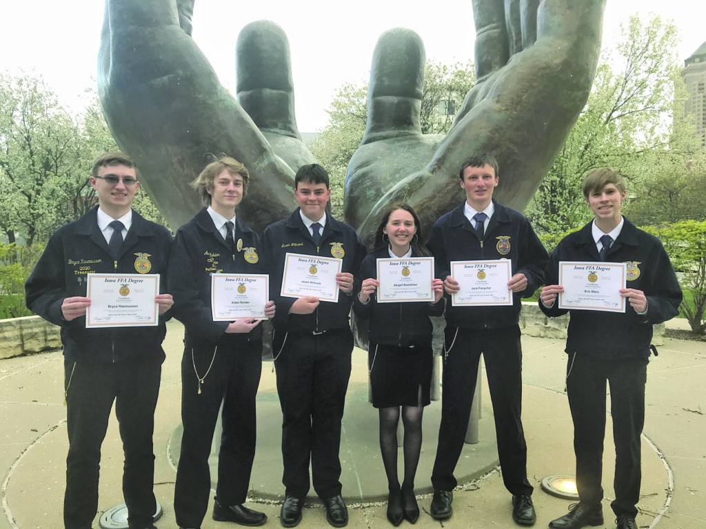 Six South O’Brien FFA members-Eric Mars, Abigail Boardman, Aidan Rehder, Jason Wittrock, Jack Farquhar and Bryce Rasmussen-received their State FFA Degrees this year at the State FFA Leadership Conference in Des Moines.