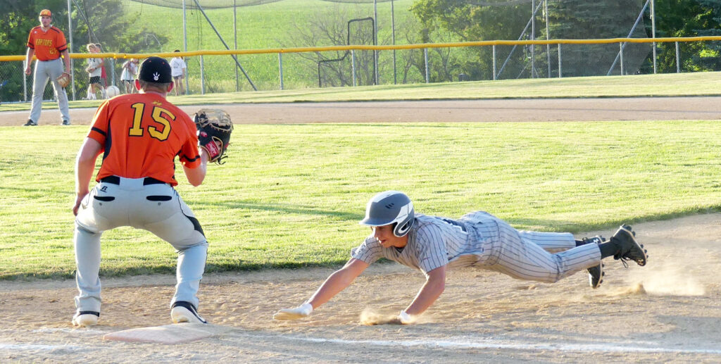 Down 10-1 in the fifth, the Wolverines tried to mount a comeback. Leadoff batter Grimm was hit by a pitch. South O’Brien’s first hit of the game came on Pete Bottjen’s infield single and both runners moved up a base on a wild pitch. With two Wolverines in scoring position, Micah Davis singled to drive in both. Davis wasn’t content to be at first so he stole not just second base but also third. That put him in position to score on Brock Riedemann’s base hit.