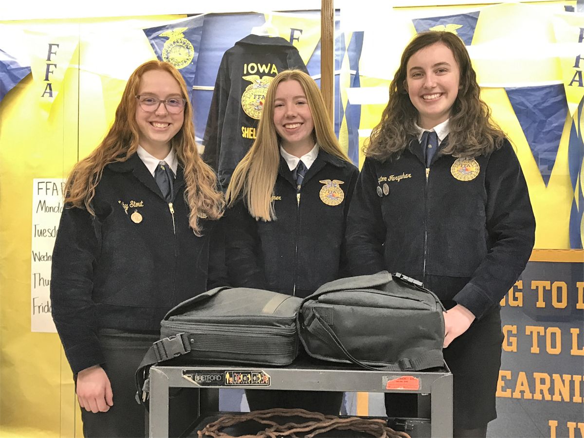Three South O’Brien FFA members participated in the Chapter Program at the NE Sub-Districts on February 24th in Sheldon. Sophomore Claire Wagner and Juniors Abby Stout and Payton Farquhar talked about different events that the FFA chapter participated in throughout the year in a powerpoint presentation. They were then asked questions about the chapter’s activities by the judges. The team placed first and advanced to the NW District contest that was held Saturday March 5th in Pocahontas. At the district contest they earned a silver rating. Abby Stout said, “The team thought it was a lot of fun telling others what our chapter has accomplished in the past year. Even though we didn’t advance to state, we were pleased with how we did.”