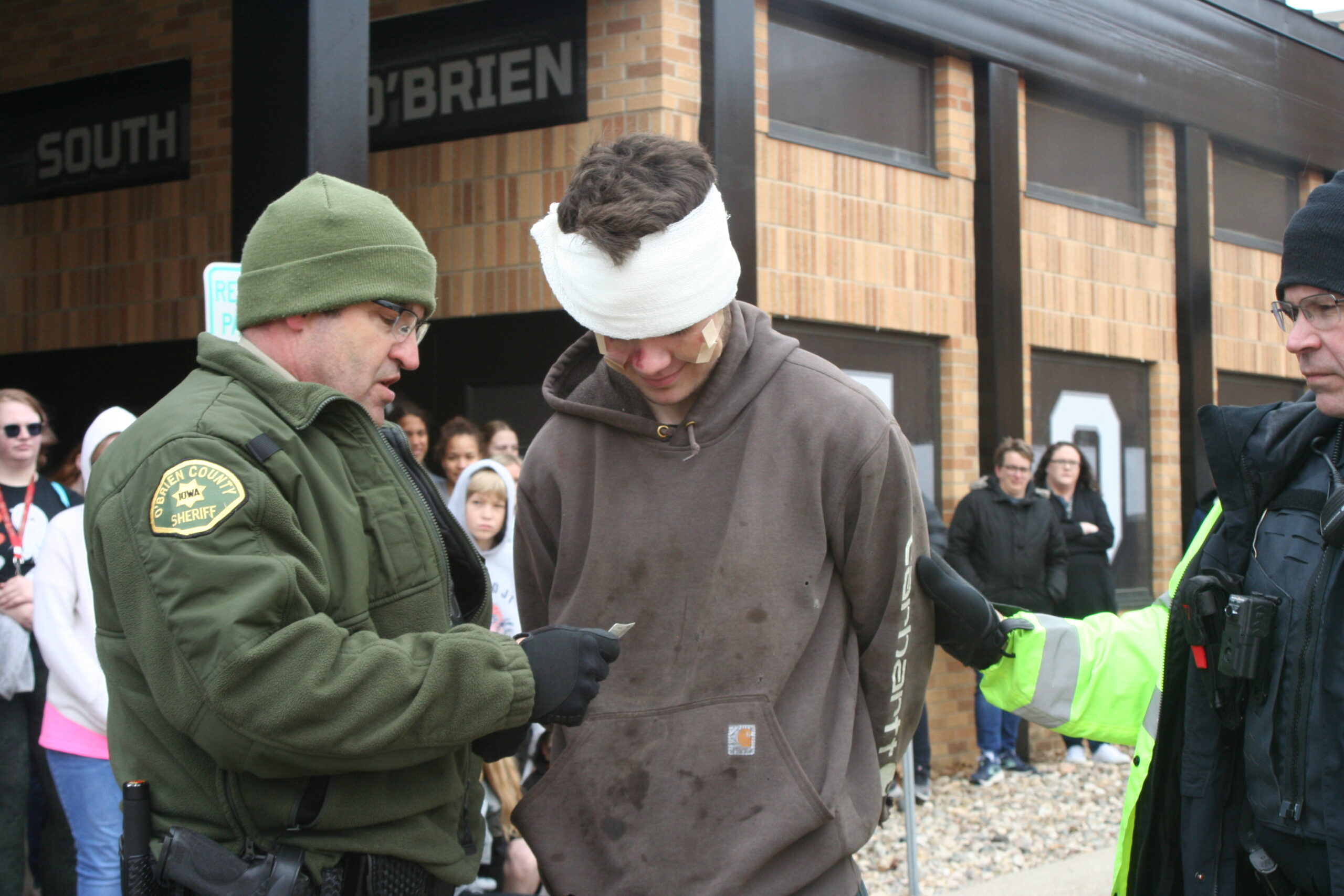 The student body was dismissed from class and sent to the commons. Some observed outside, others through windows. Emergency vehicles came screaming lights and sirens into the parking lot. Each participating member is an actual member of his or her respective response unit. It took them several minutes to arrive. According the Sheriff Bruce Devereaux it was a rapid response compared to many real life incidents. Upon arrival, professionals began assessing the situation: how many vehicles? how many victims? What are their conditions? Responders almost immediately called for additional ambulance services. Sutherland and Primghar showed up. Iowa State Patrol showed up.