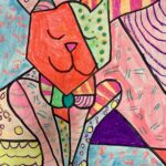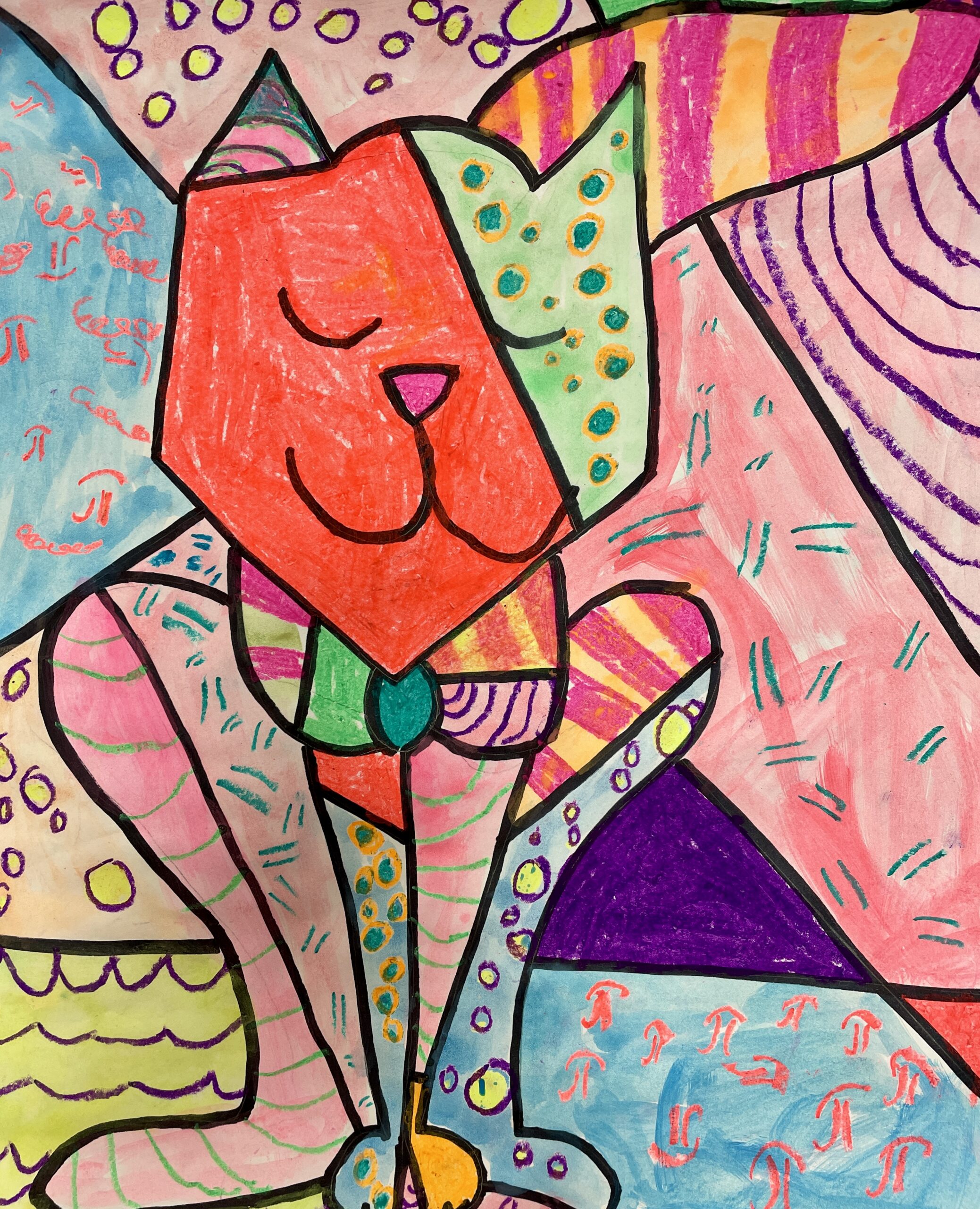 According to Jillian Mews, South O’Brien Elementary Art teacher, “This art piece was inspired by our study of Pop Artist Romero Britto. Britto’s style features a combination of Cubism, Graffiti, and Pop Art infused images and colors.” Roxi used neon oil pastels and neon Tempera paints under Mrs. Mews’ direction to create the cat body and lines of division. Patterns of shapes, lines and colors were added to fill and create the background.