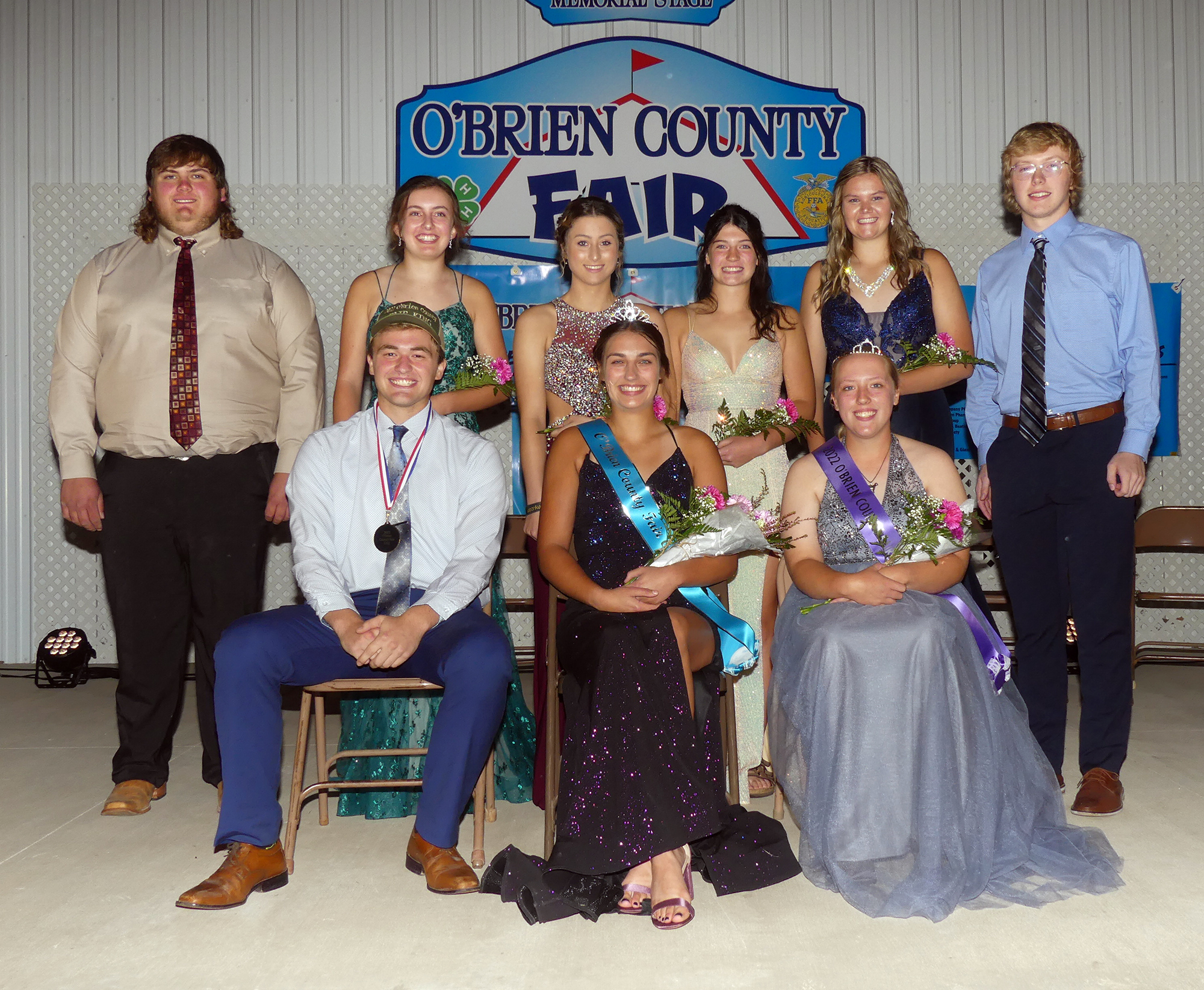 The 2022 O’Brien County Fair Royalty Were Crowned Monday Night At The Coronation Ceremony. They Are, Seated From Left, King Dain Moermond, Queen Grace Fuhrman And Princess Makenzie Meyer. The King And Queen Candidates Also Included, Standing From Left, Jackson Albert, Payton Farquhar, Madisen Fischer, Morgan Grooters, Samantha Wilbur And Grant Wagner.