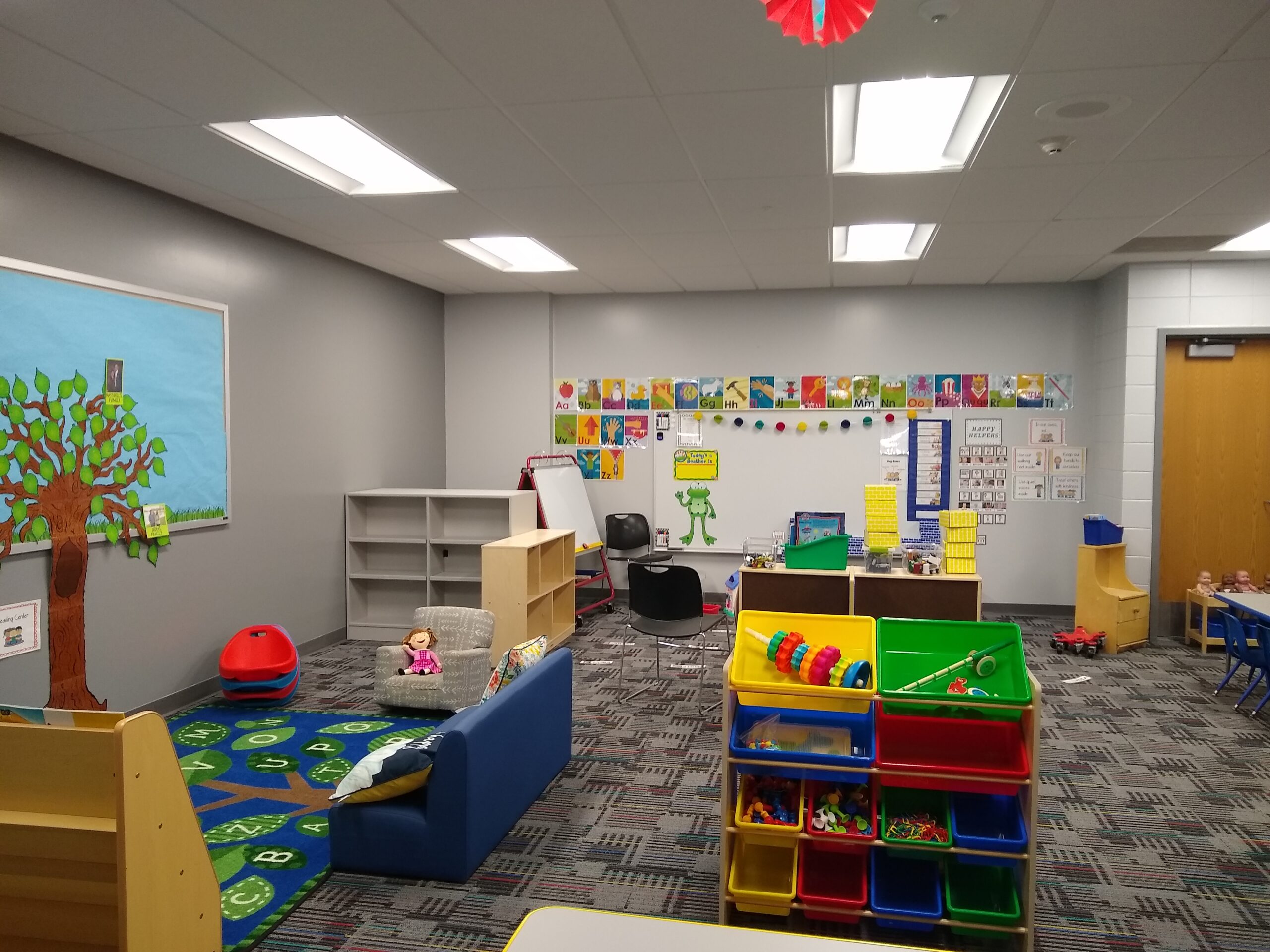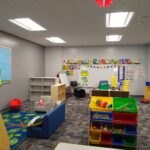 The 3-year-old preschool space was once 2 computer labs. The wall was removed for more space and “a clone” of the 4-year-old preschool was constructed. A bathroom for toddlers was also installed right in the classroom. A second exit needed to be installed for safety reasons. Some parts of the room are carpeted, some is tile for those really fun but messy projects. Cubbies were added and some age-appropriate furniture and toys. The room came in at a cost of approximately $30,000.