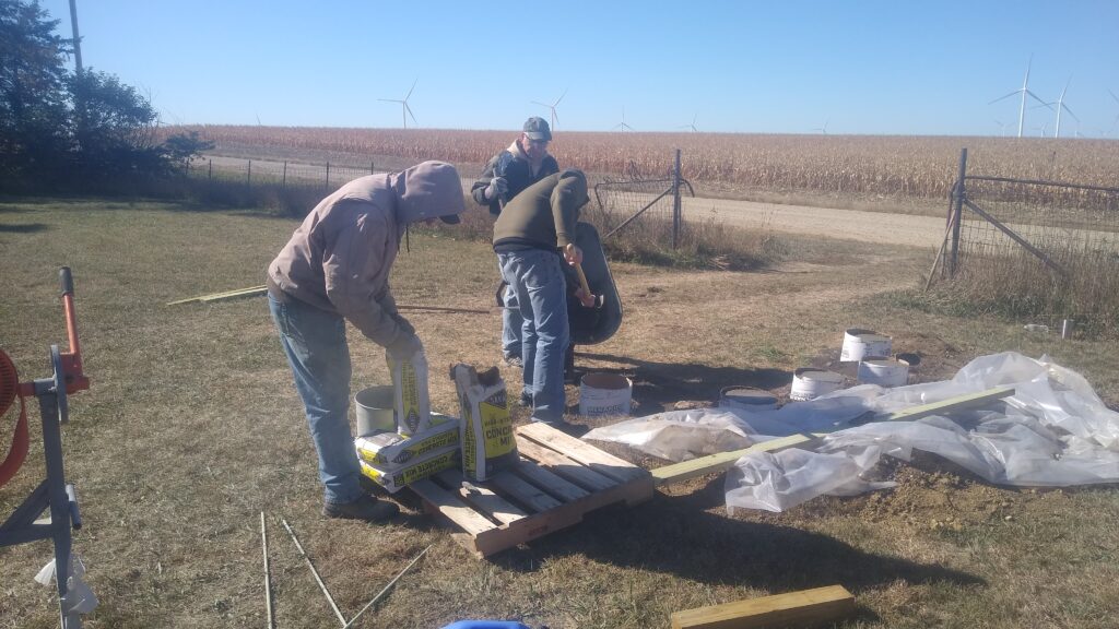 Volunteers turned out to Highland Doyle Cemetery last Saturday to pour concrete for the base of the new directory soon to be erected at the cemetery by O’Brien County Cemetery Preservation Association. Pictured are Chuck Virgil, Pastor Brett Witmer, and Roy Wohlert.