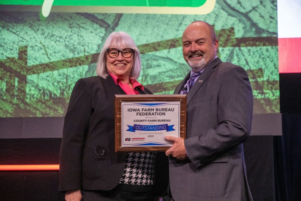 The O’Brien County Farm Bureau was recognized as an “Outstanding County Farm Bureau” during Iowa Farm Bureau Federation’s 104th annual meeting held Dec. 6-7 in Des Moines. O’Brien County Farm Bureau Board President, Karen Appleton of Sanborn accepted the award on behalf of the county.