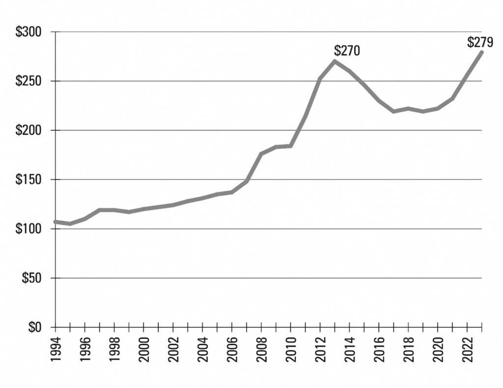 The survey shows an increase of 9% in 2023, for a state average of $279 per acre. The new record is 3.3% higher than the previous record set in 2013, when rent was $270 per acre. The increase in rent since 2013 compares to a 2.8% increase in the non-inflation adjusted price of corn, and a 4.4% decrease in the price of soybeans.