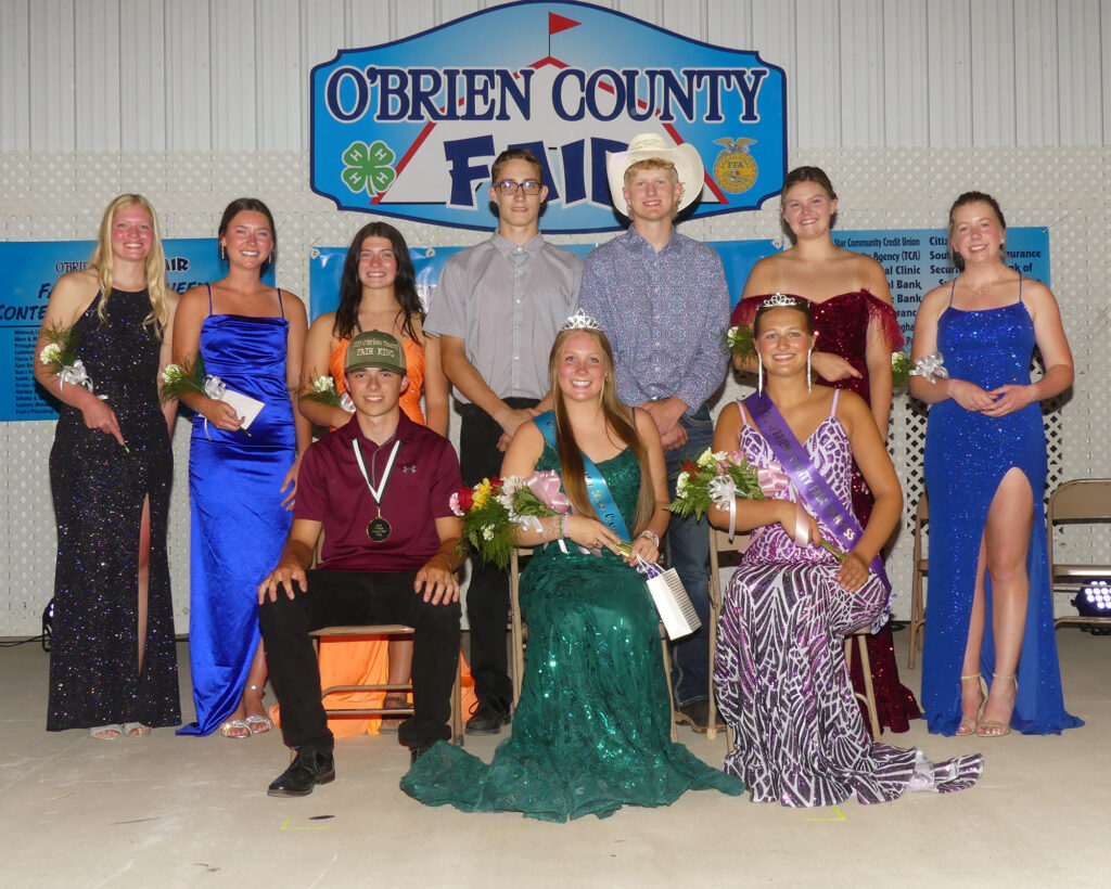 The 2023 O’Brien County Fair Royalty were crowned Monday night at the Coronation Ceremony. They are, seated from left, King Jayson Stamer, Queen Ellen Hunt and Princess Kourtney Dekker. The King and Queen candidates also included, standing from left, Makenna Hofmeyer, Whitney Einck, Morgan Grooters, Bryce Dodge, Justice Frerk, Samantha Wilbur and Claire Wagner.