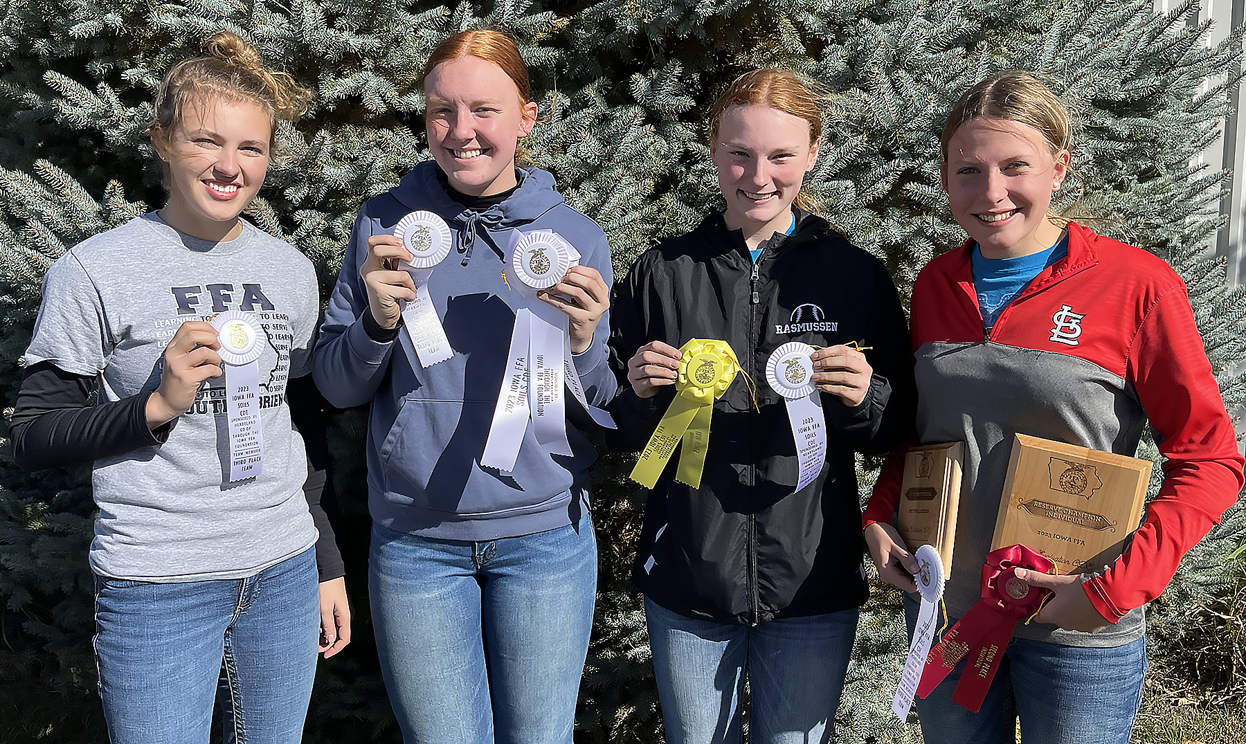 The South O’Brien FFA team of Brelee Rasmussen, MaKenna Wallin, Reese Farquhar, and Abby Woodall traveled to Iowa State University and competed on Saturday, October 21st. At the state competition, the team finished 3rd, punching their ticket to nationals. Individually, Abby Woodall had the top score in the Pit Judging and was Overall Reserve Champion, missing out on the top spot by only five points. BreLee Rasmussen ended up in a four-way tie for fourth place, and placed 5th after the tie-breaker.