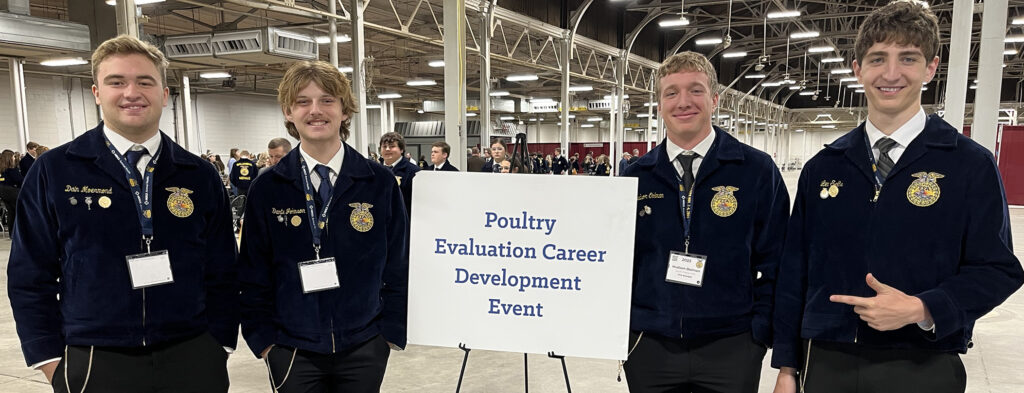 “All four on the team were very active in FFA throughout high school and had previously competed at the national level in meats and soil evaluation events.” said South O’Brien FFA Advisor Eric Kumm. “The last time we had a team compete in the National Poultry contest was in 2009, before Iowa even had a state contest. This time was a bit challenging since all of the guys are busy with classes and college life. They have always made competing in events fun, but still know when to get down to business. Probably the most difficult part for them was the written exam since there is just so much technical information to learn. But we acquired some new information to help out next time if we have a team qualify again.”
