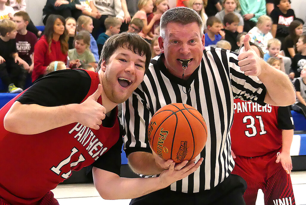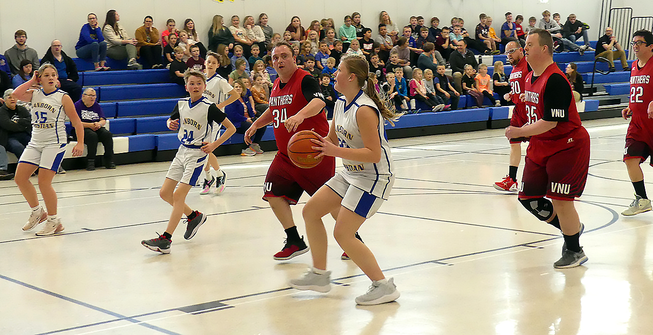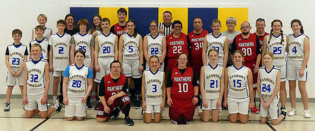 The Village Northwest Unlimited Panthers recently played a return engagement at Sanborn Christian School. VNU’s Special Olympics basketball team took the court February 20 to face a team made up of students from the upper grades, both girls and boys.