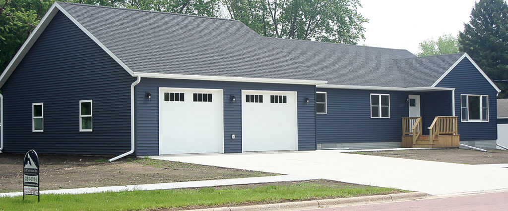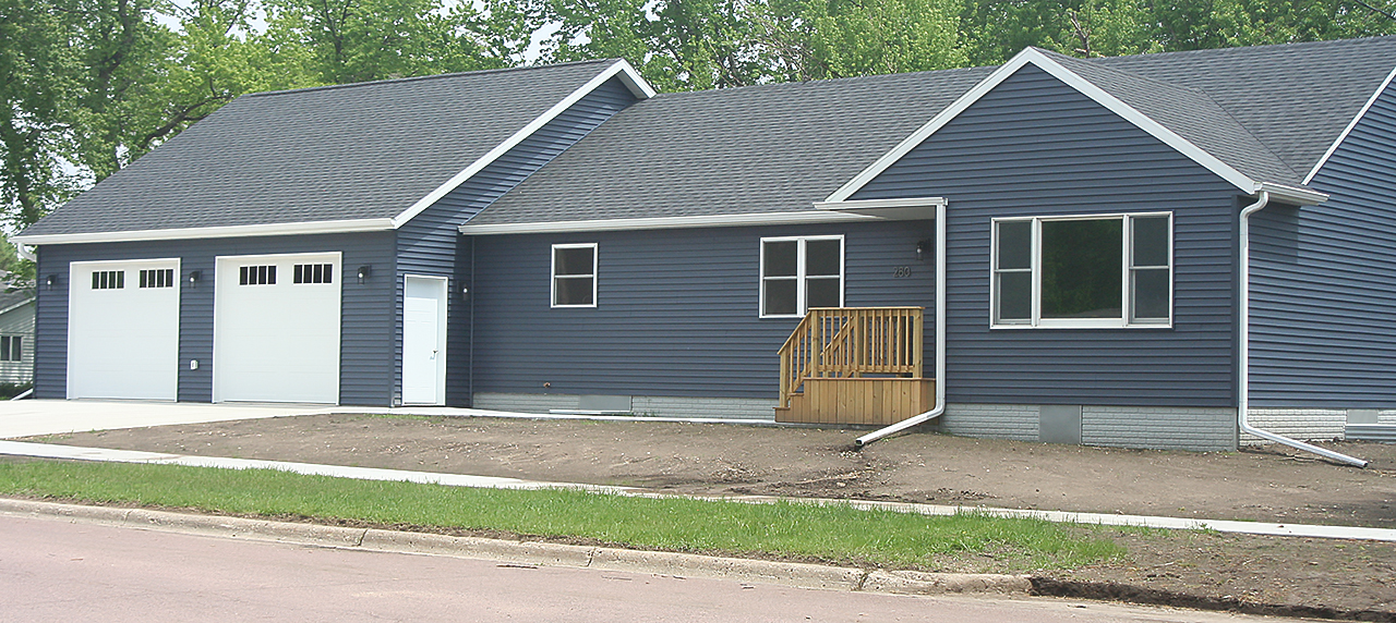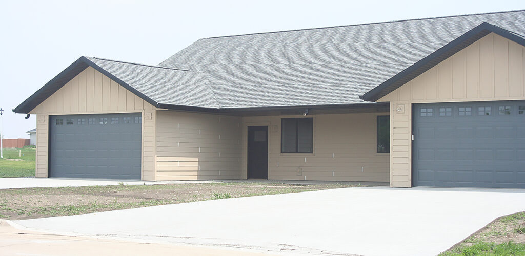 Judy Mehrens has agreed to purchase one of the units, making her rural home available. Her son is returning to the home farm with his family. This is a “Cinderella” story. The remaining unit is 2-bedroom with a master bath and a guest bath. They are built on grade concrete foundation. The unit features an open floor plan with a concrete shelter/closet and a 2-car garage.