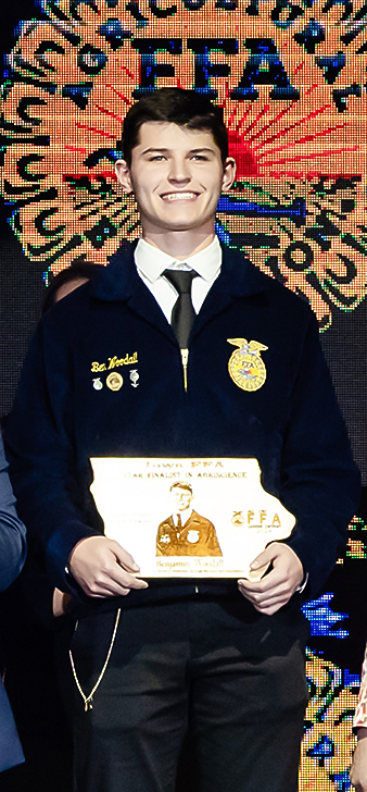 Ben Woodall was recognized as a State Star Finalist in Agriscience. He stated “ I performed a science fair project my freshman year about the moisture needed for soybean emergence, as well as my work last summer at the Northwest Research Farm for Iowa State University. I filled out multiple short answer questions describing what I did throughout my work and projects, and was interviewed by a panel of judges as to why I deserved to be the Star in Agriscience.”