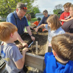 Rain delays kept interrupting planting at the Sutherland Library. A planned “Kids’ Garden” utilizing 2 raised garden beds from the Sutherland Park Board and 7 lick tubs offered a few basic planting containers for veteran gardners Steve and Wendy Koch to lead a kids’ garden program at the library. Clear enough weather came through, finally, on Thursday May 16.