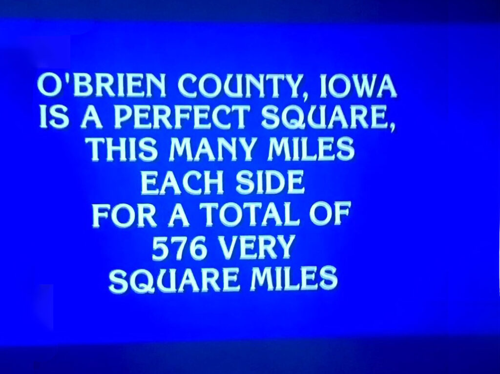 The statement reads, “O’Brien County, Iowa is a perfect square. This many miles each side for a total of 576 very square miles.”
