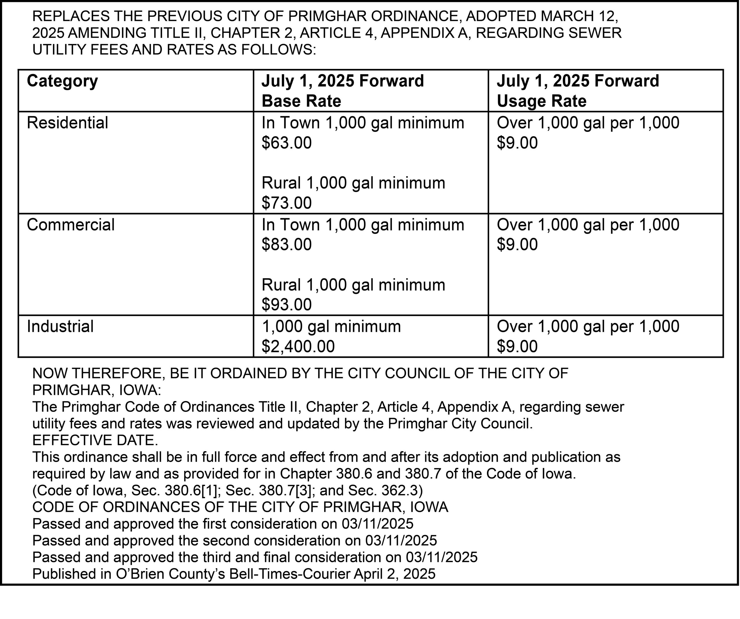 City Administrator, Jaynee Rushton, reported that a public hearing was scheduled to receive public comments on the ordinance amending Title II, Chapter 2, Article 4, Appendix A, regarding sewer utility fees and rates. Mayor Pro Tem Smith opened the public hearing calling for all written and/or oral comments. City Administrator Jaynee Rushton reported that staff has been working on final costs associated with Primghar’s sewer project and that sewer utility fees and rates will need to be increased to cover Primghar’s bond obligations. Having no written comments nor hearing any oral comments, Mayor Pro Tem Smith closed the hearing. It was moved by Councilmember Honkomp and supported by Councilmember Jenness to approve the first reading of the ordinance amending Title II, Chapter 2, Article 4, Appendix A, regarding sewer utility fees and rates. Upon roll call vote, the vote was as follows: Ayes: Wittrock, Jenness, Honkomp, Miller, Smith. Nays: none. It was then moved by Councilmember Wittrock and supported by Councilmember Miller to suspend the requirements of Iowa Statute 380.3 that a proposed ordinance or amendment must be considered and voted on for passage at two council meetings prior to the meeting at which it is passed. Upon roll call vote, the vote was as follows: Ayes: Wittrock, Jenness, Honkomp, Miller, Smith. Nays: none. Whereupon Mayor Pro Tem Smith declared the motion approved. It was moved by Councilmember Jenness and supported by Councilmember Honkomp to approve the final reading of ordinance amending Title II, Chapter 2, Article 4, Appendix A, regarding sewer utility fees and rates as follows: