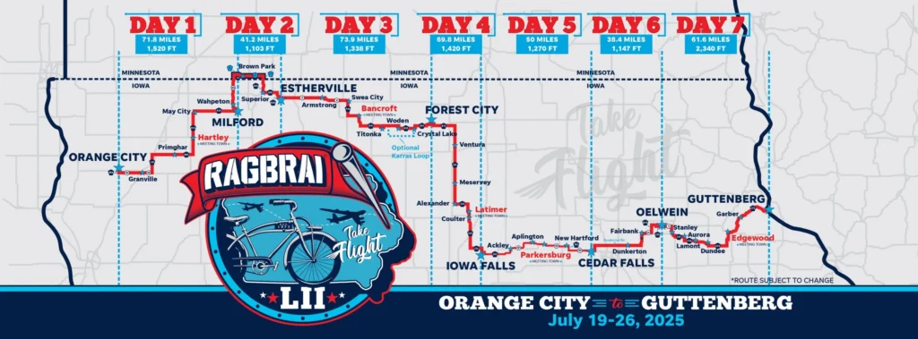 2025 is RAGBRAI LII. Riders travel through Primghar every few years. The last trip through town, like this year, coincided with the opening day of O’Brien County Fair. This year, all riders should be out of Primghar by 2:00pm. Animals are scheduled to arrive at Fair Grounds that same evening, Sunday July 20, after 4:00pm. If these schedules hold, traffic snarls should be minimal.