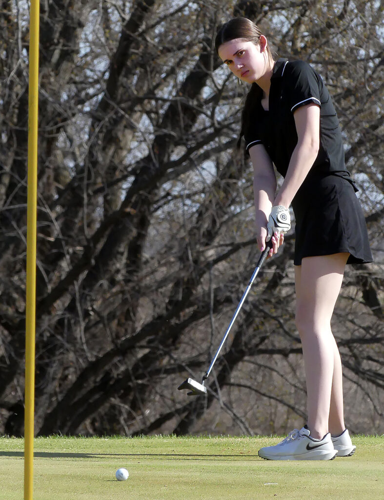 South O’Brien dueled Harris-Lake Park April 22 at Lake Park’s Silver Lake Country Club and came away with a split in War Eagle Conference action. The girls won 205-221 and the boys fell to a locked in Wolves squad 158-189. “It was a perfect night for golf, but some of our golfers made it harder than it had to be,” remarked South O’Brien coach Kris Faust. “We duffed and sprayed some balls off the tee, played in the wrong fairways, battled the trees, and struggled reading greens. Even so, we walked away with a win on the girls’ side, four of the eight medals on the night, and several personal bests. I was proud of the way our golfers managed the adversity to bring in respectable scores.”