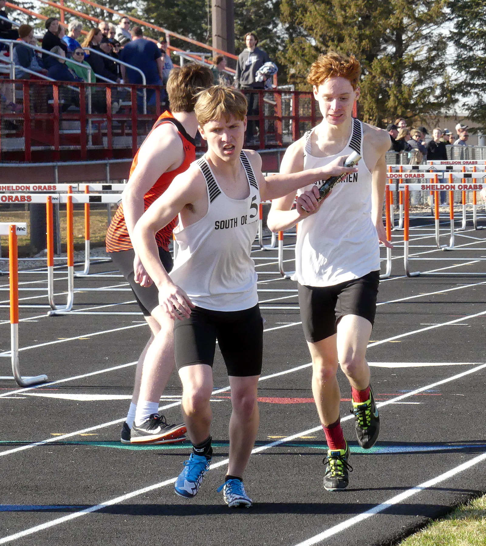 Sam Daniels takes the baton from Brenden Wilson in the exchange zone of the 4×800 relay.